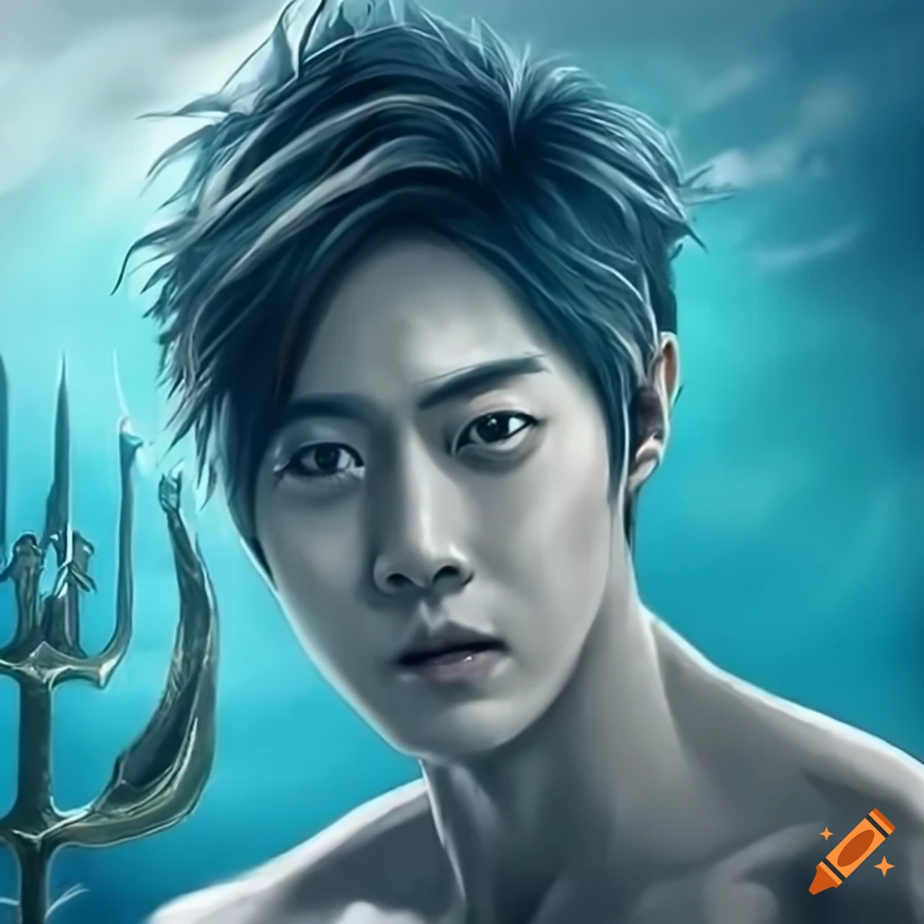 Kim hyun joong as poseidon with a shining trident underwater on Craiyon