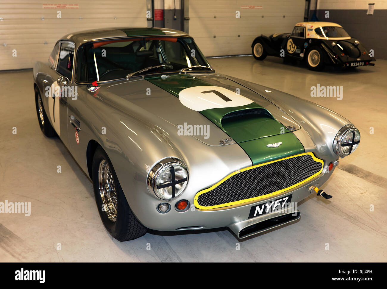 Three-quarters front view of a silver, 1961 Aston Martin DB4, in ...