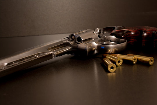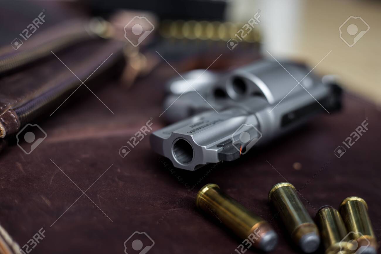 44 Magnum Revolver Handgun With Bullet On Leather Background Royalty Free Stok Fotoğraf, Resimler, Görseller ve Stok Fotoğrafçılık. Image 131134723