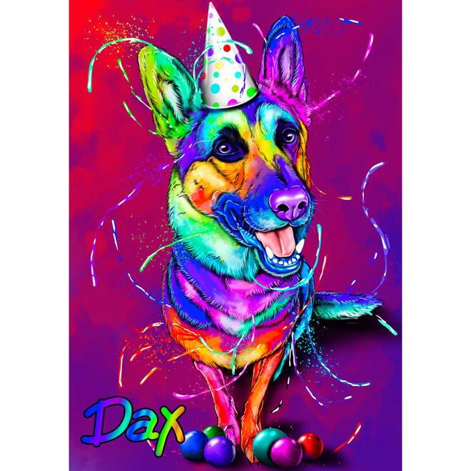 Renkli Arka Plan ile Suluboya Tarzında Alman Çoban Partisi Karikatür Portresi