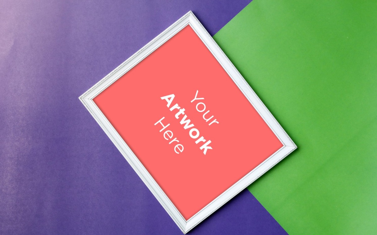 Yeşil ve mor renkli kağıt arka plan ile kare ahşap çerçeve maket