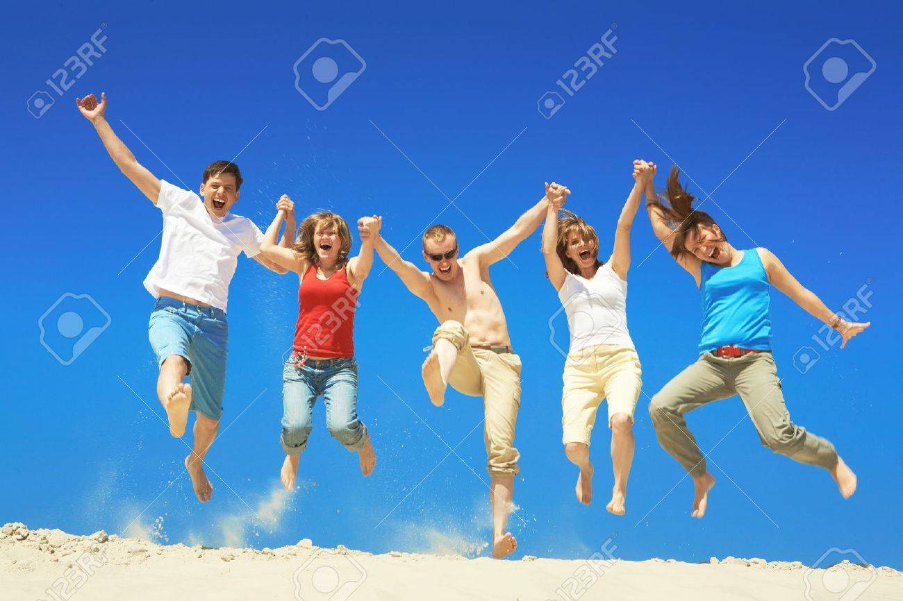 El Ele Tutuşup Zıplayan Beş Mutlu Insan Portresi Royalty Free Stok Fotoğraf, Resimler, Görseller ve Stok Fotoğrafçılık. Image 9164243