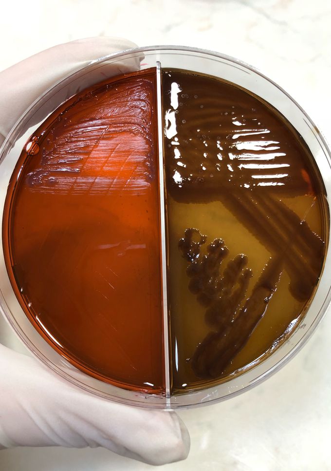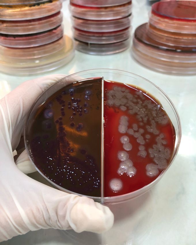 Pseudomonas aeruginosa hemolysis on blood agar; Staphylococcus aureus and S.epidermidis colony comparison. .