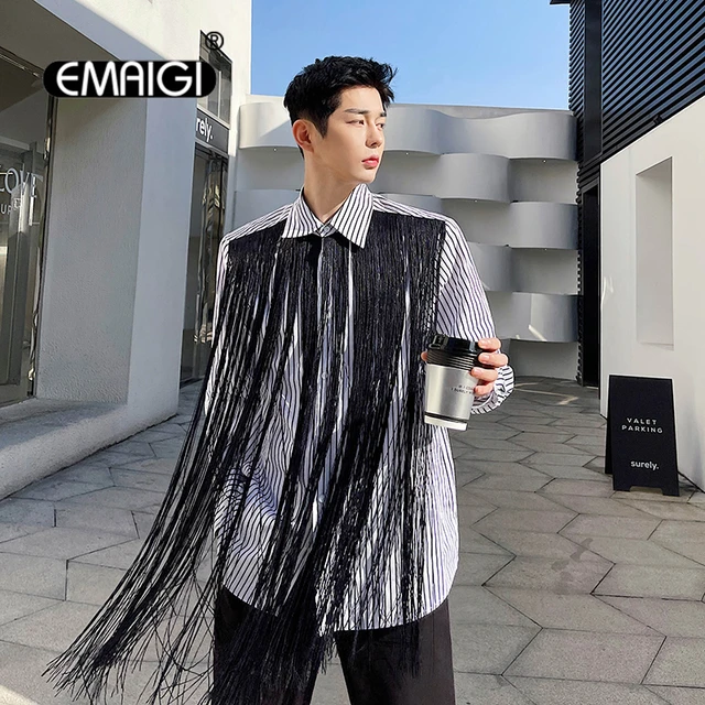 Erkek püskül moda uzun kollu gevşek Casual çizgili gömlek üstleri adam Streetwear Vintage gömlek sahne giyim erkek - AliExpress